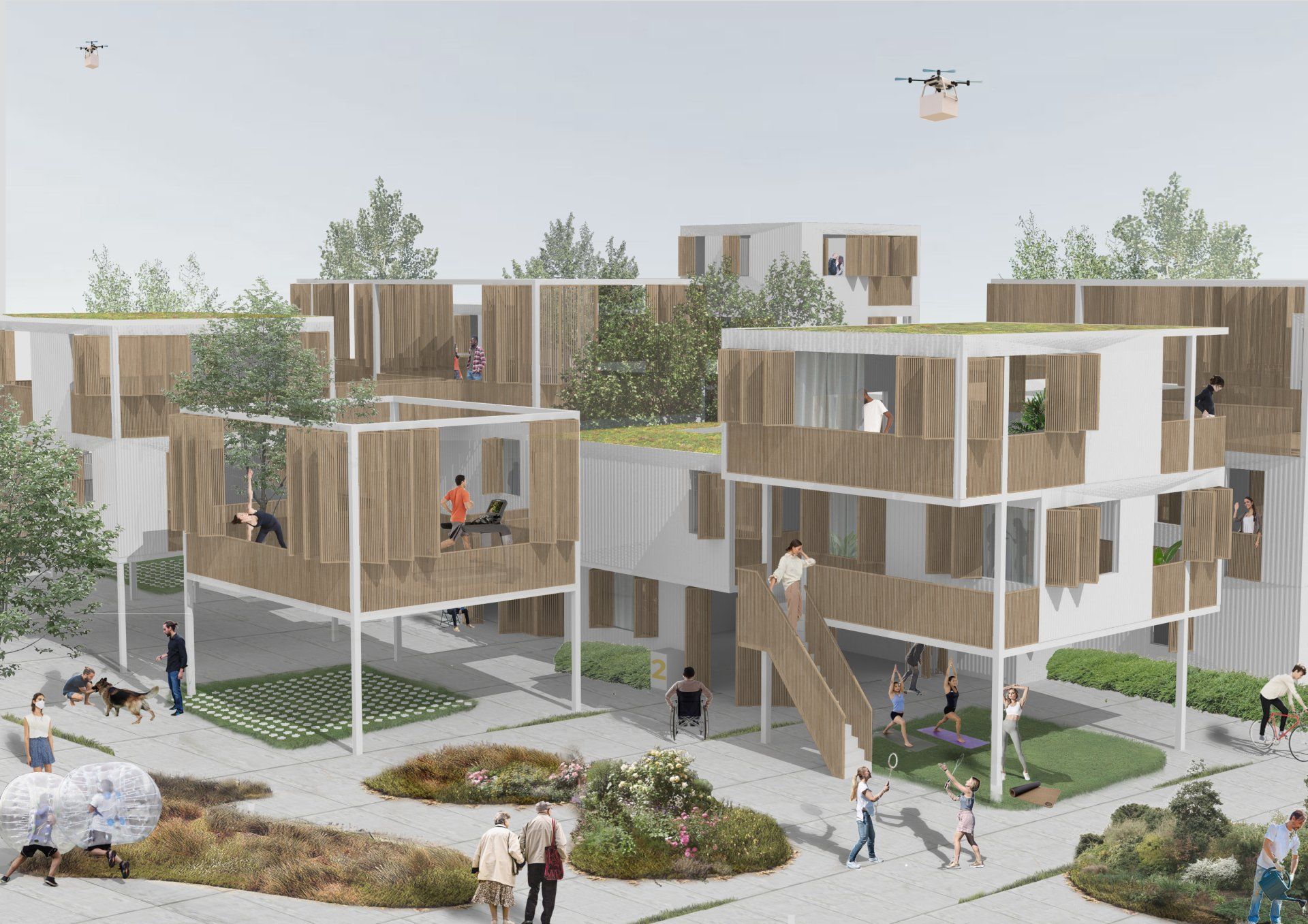 The idea is to maximize natural light and increase the human connection with nature and increase well-being without leaving the city. For that we create an amalgam of volumes (homes and flats). The volumes are separated from each other in order to benefit from the sunlight and create internal streets where interaction between neighbours can happen. Some of the volumes are the terraces or ‘gardens’ to some of the homes and are connected through platforms to encourage users to move and give the feeling of spaciousness. Everything is interconnected but ‘flexible privacy’ is a must. The complex is filled with vegetation, creating a ‘wild urban’ context.